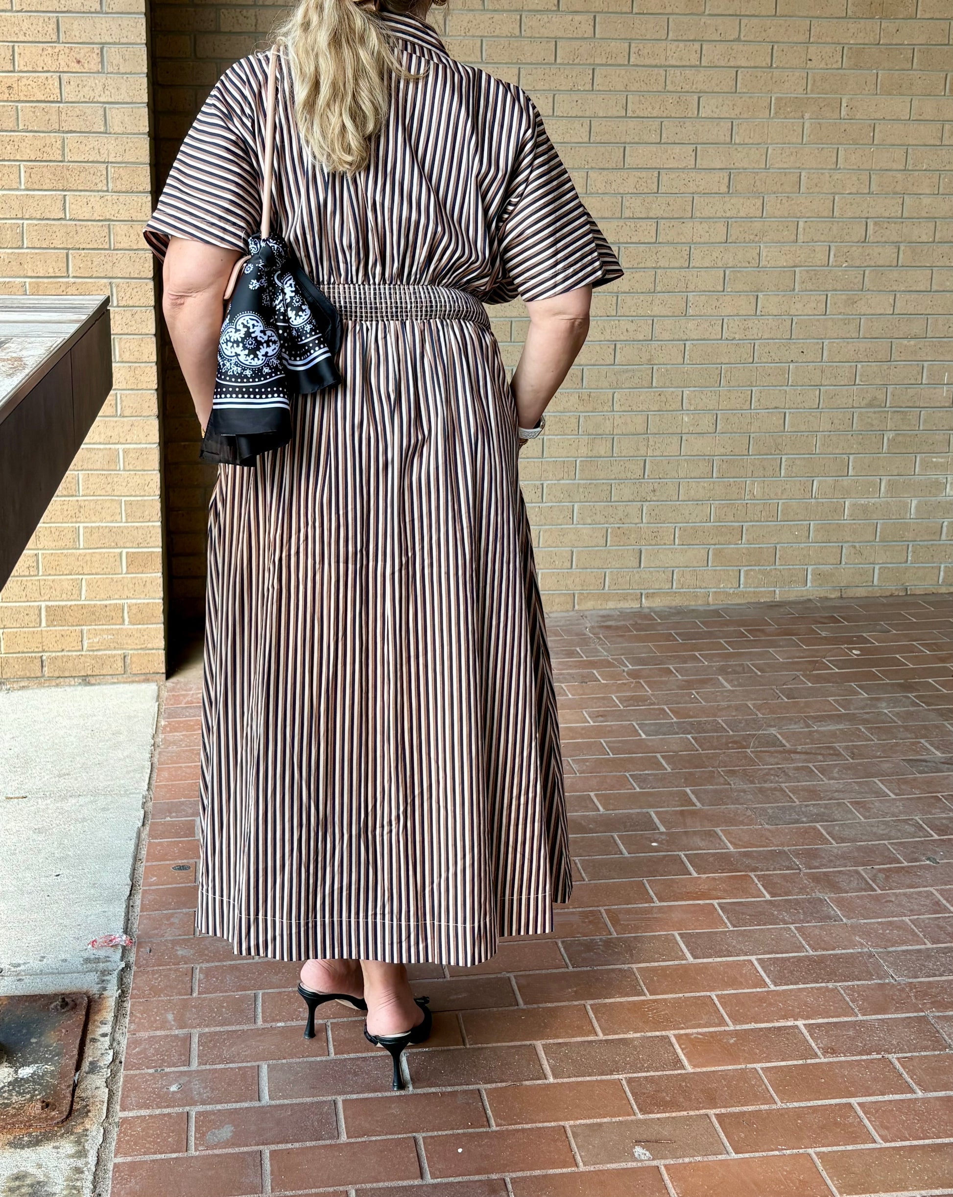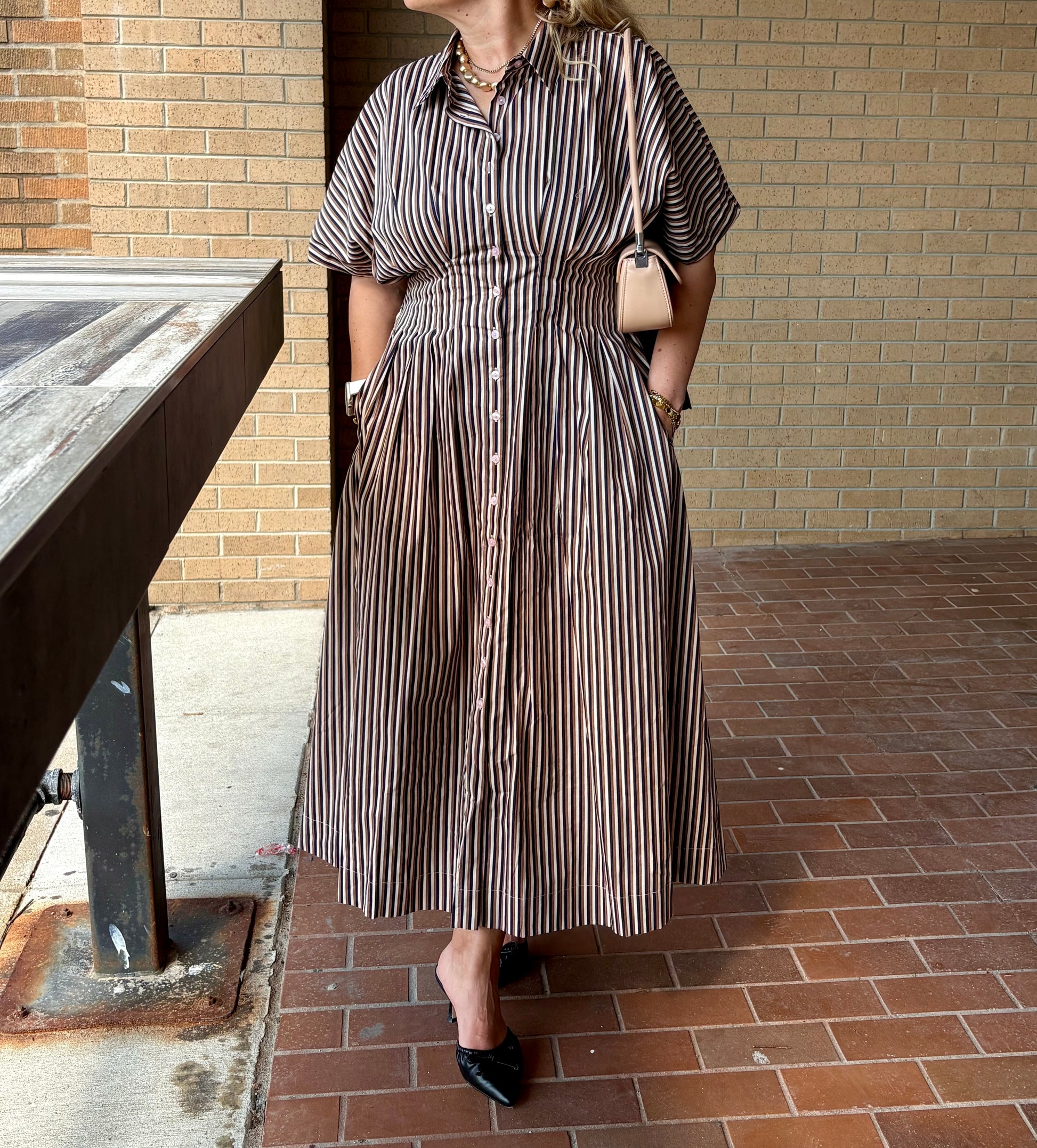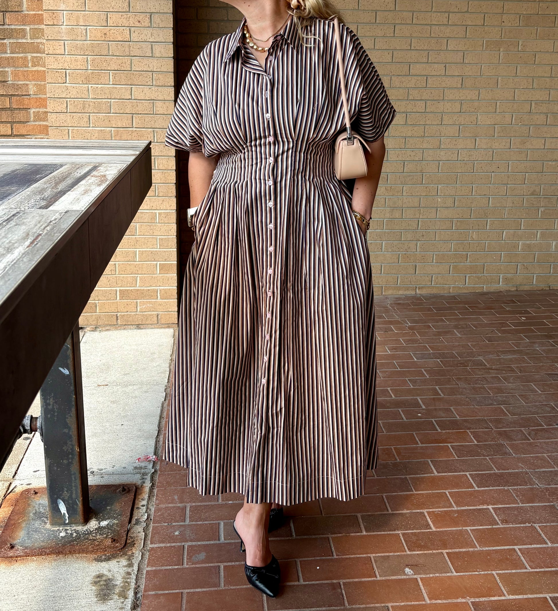 Barkline Stripe Pleated Midi Dress-Erin Rose Boutique-Classic stripes meet effortless charm in this must have dress. This midi dress features a button-down front, half sleeves, a smocked waist, and pleated details, offering a flattering silhouette with functional side pockets. Style it with espadrilles, a woven tote, and oversized sunglasses for a chic daytime look.