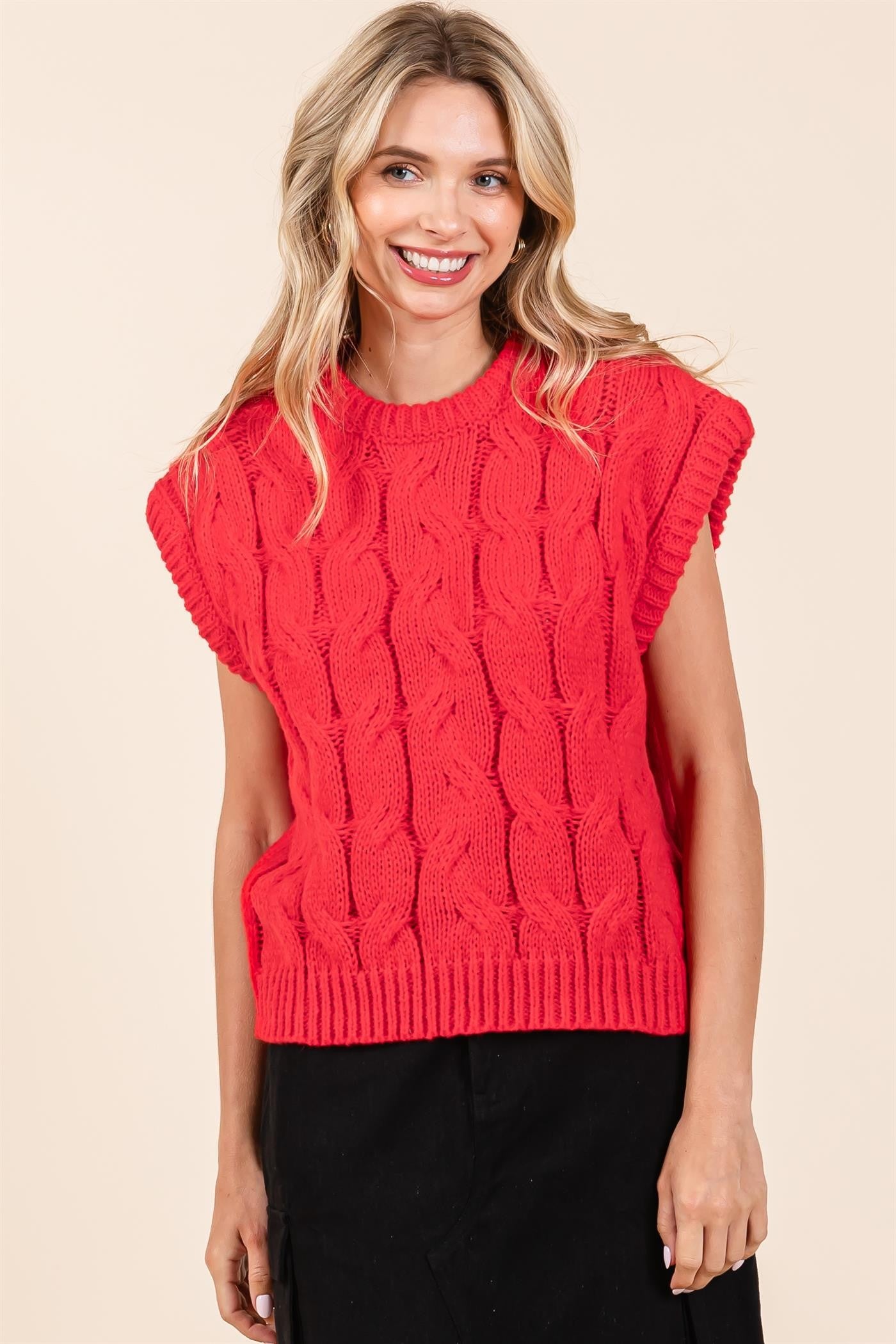 solid, cable knit, sweater vest, vest, ribbed, round neck, sleeveless, ribbed trim, regular size, standard, young contemporary, contemporary, trendy, stylish, fashionable, daily wear, everyday wear, Fall, Winter, F/W, women's clothing, women's apparel, women's wear,