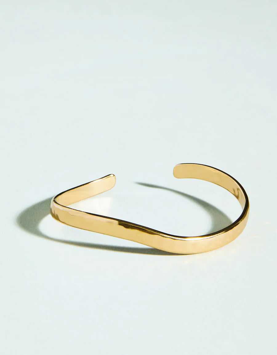 Say yes to our classic gold cuff, perfect for everyday wear. This textured wavy Colleton River Cuff is a must have for an endless summer. Designed to shine through everyday wear, exercise, showers and a summer at the beach in tarnish free 14kt gold vacuum plating. Great for stacking or mixing and matching.