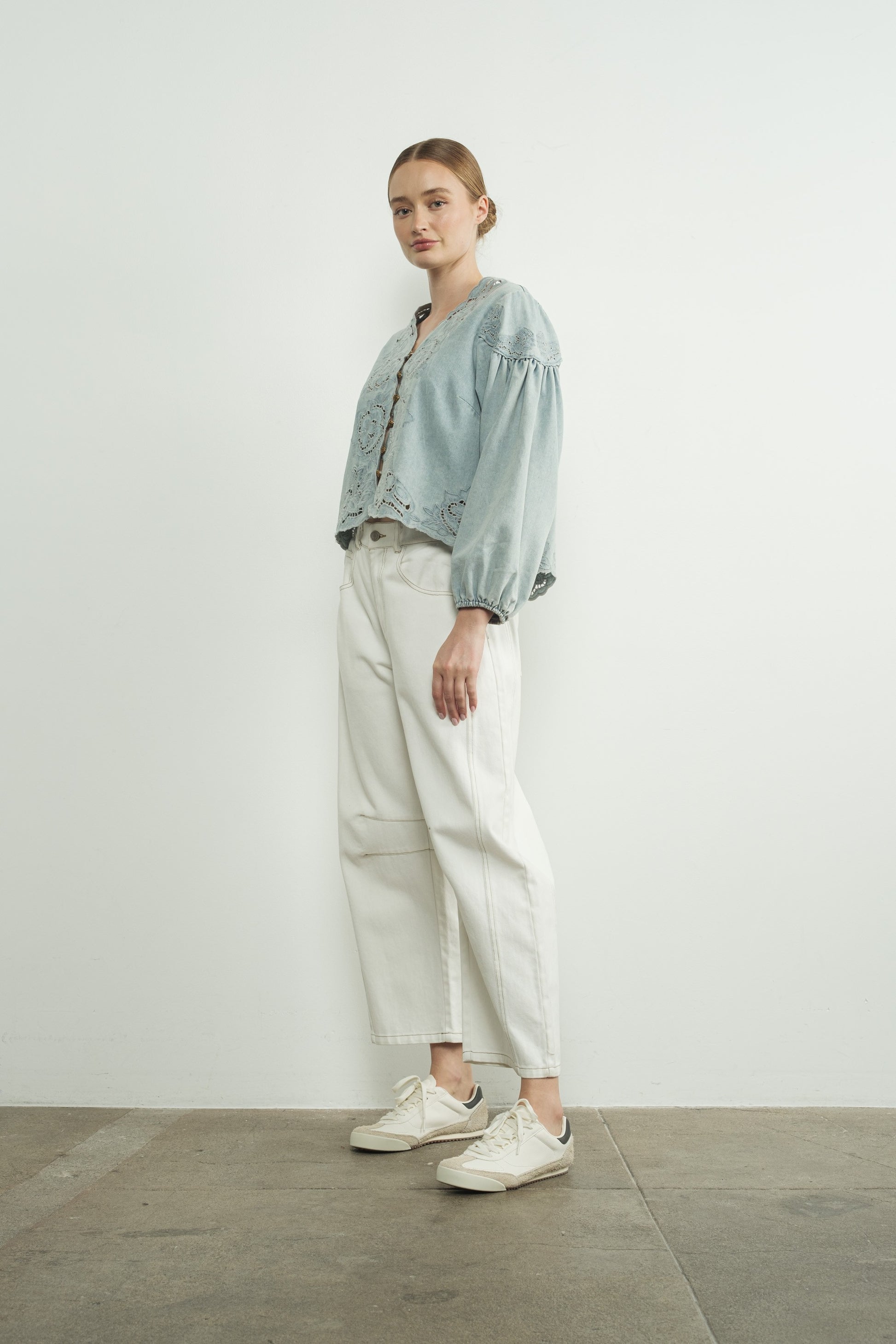 This light-wash denim blouse features intricate floral embroidery and delicate cutouts, adding a feminine touch to its relaxed silhouette. The V-neckline and button-down front create a classic look, while the balloon sleeves with elastic cuffs provide a trendy and comfortable fit