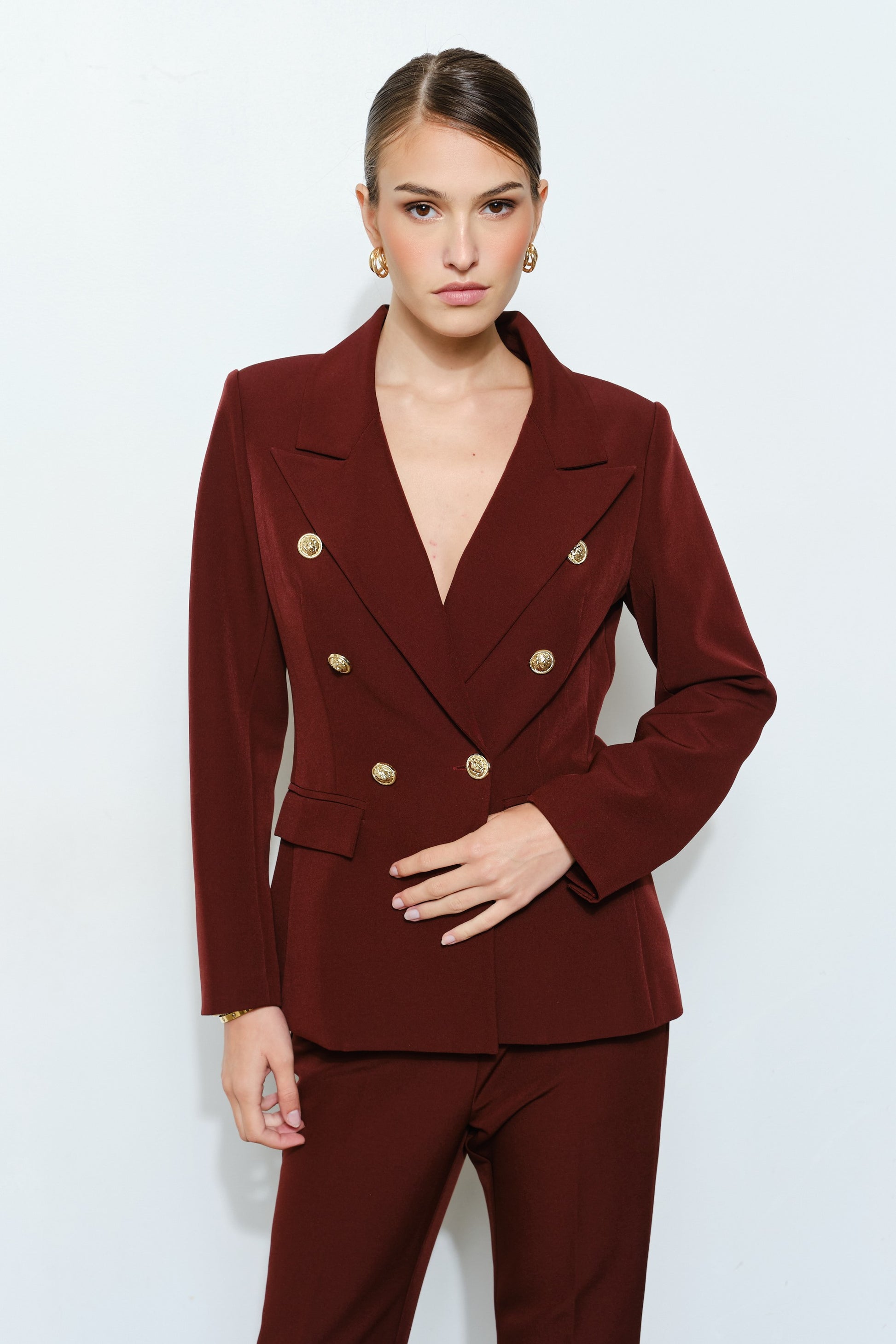 -Elegant double-breasted design with gold button details