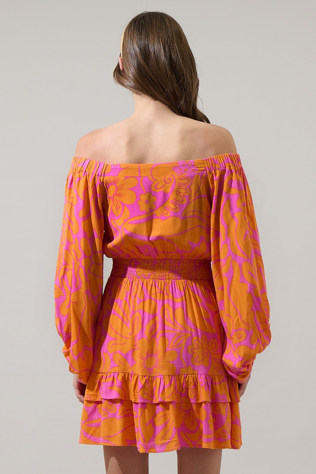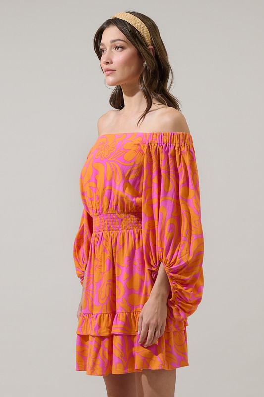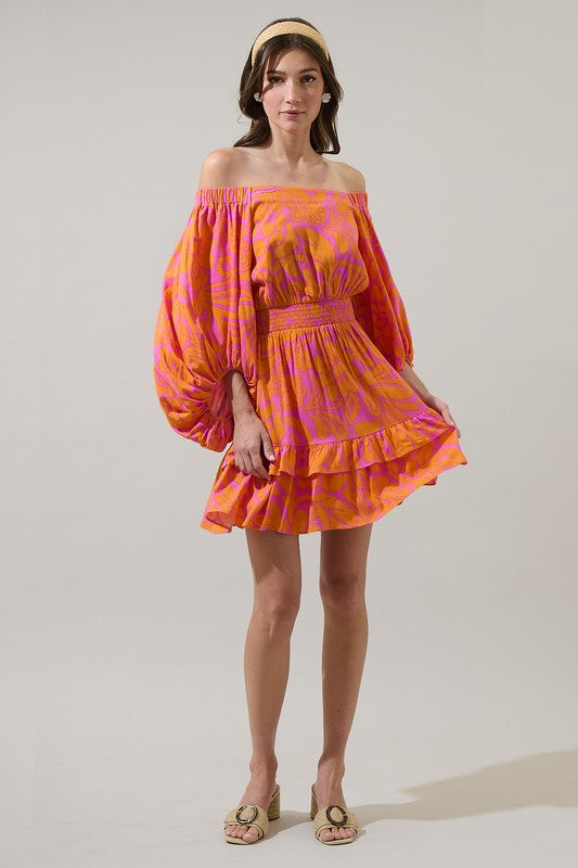 Let your wardrobe shout vacay mode ON! ☀️🌴 This bold and bright mini dress is serving major sunset-in-Paradise vibes. With a flirty off-the-shoulder neckline, a stretchy smocked waist, and tiered ruffle skirt, it’s the dress made for rooftop cocktails, beachside brunches, and twirls under twinkle lights.