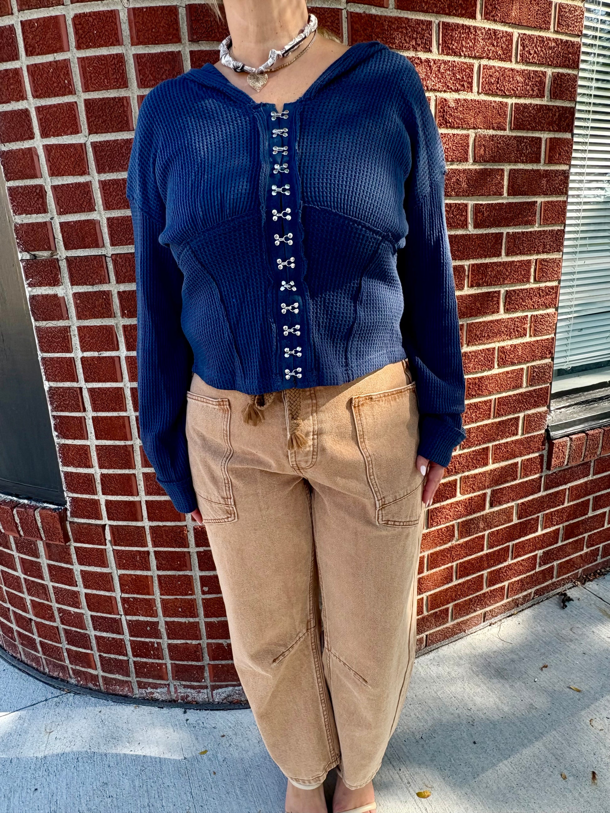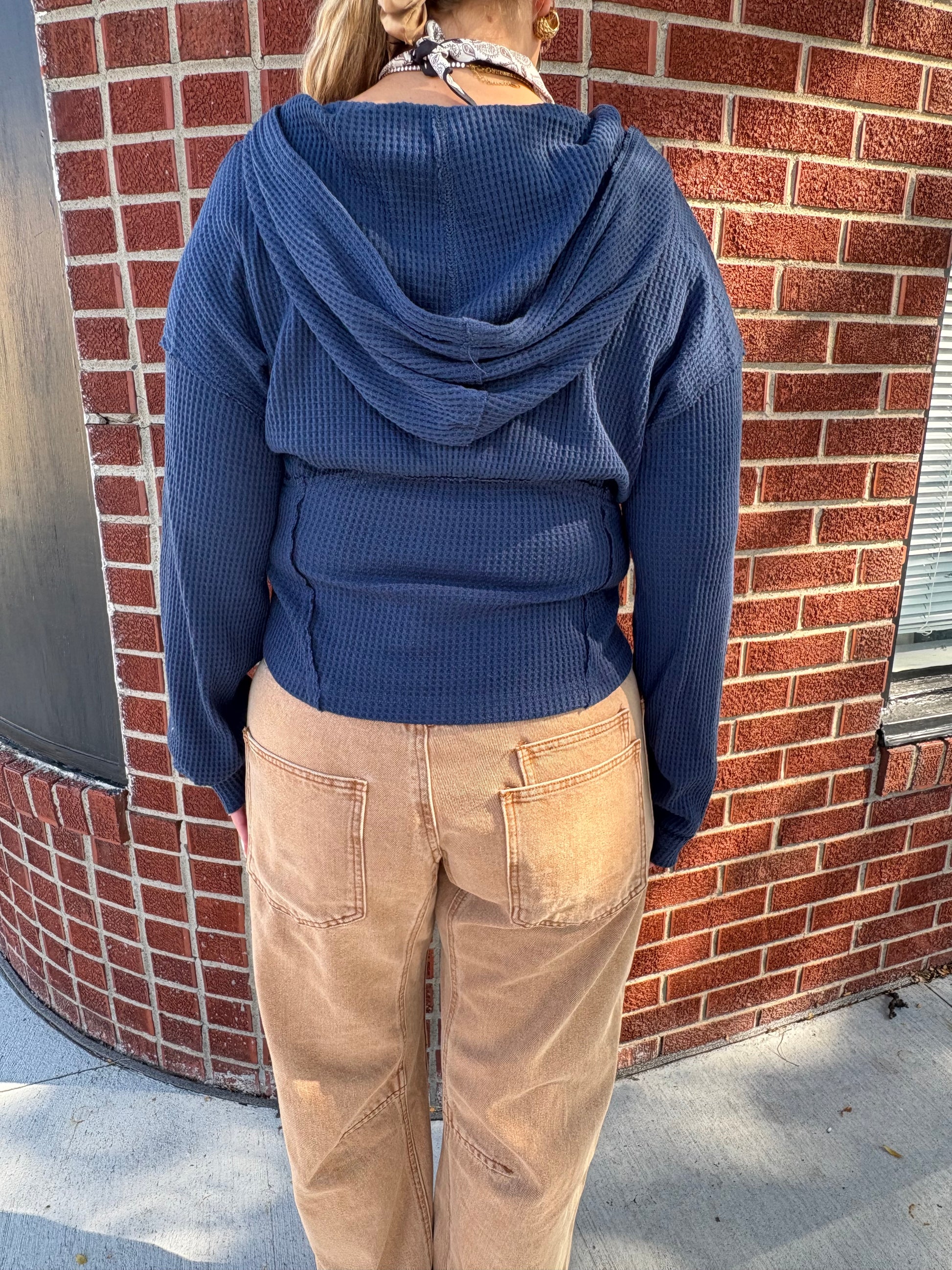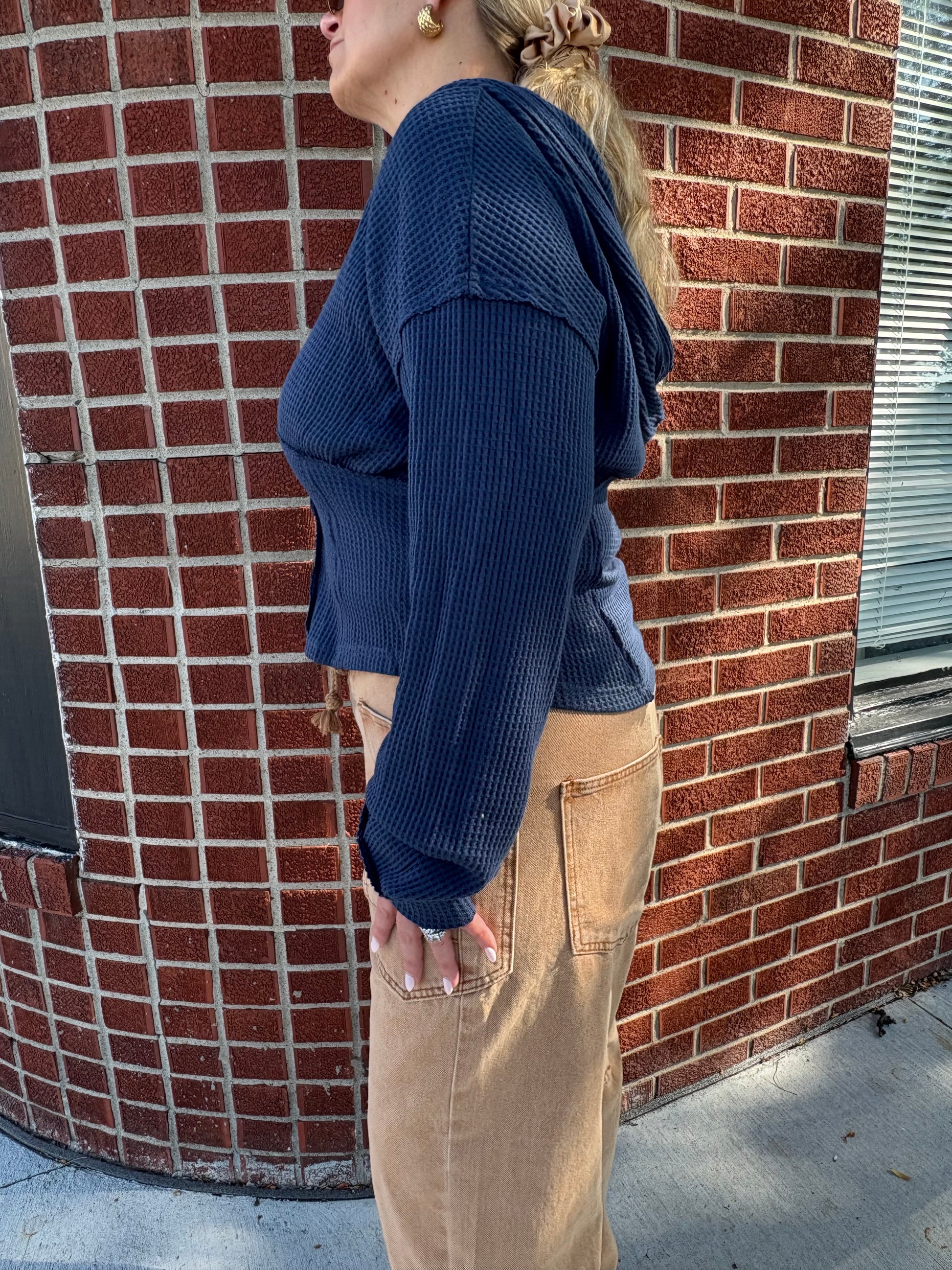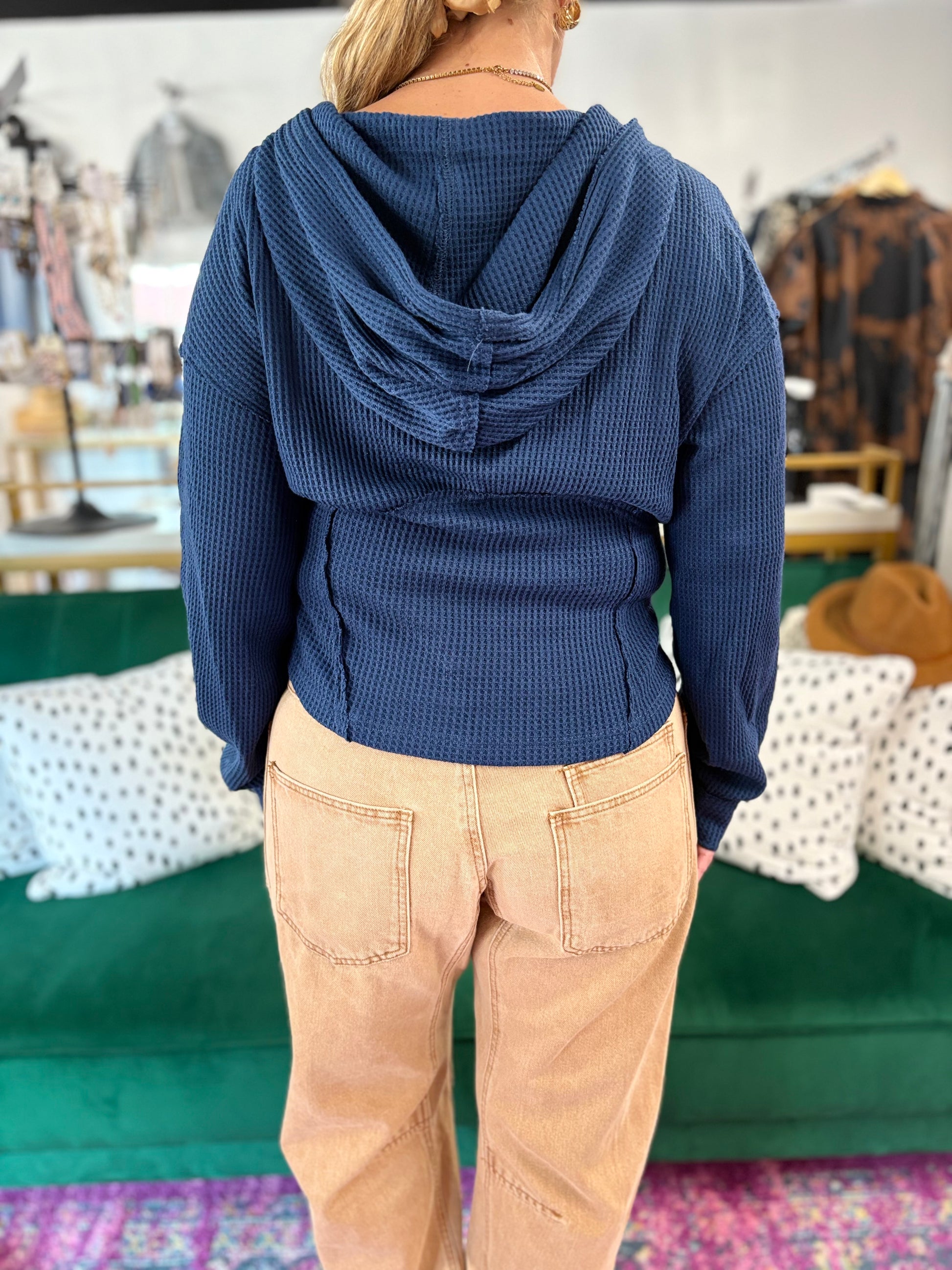 Textured Thermal Fabric: Made from a cozy waffle knit for a laid-back yet structured look - Corset-Inspired Fit: Seamed waistline and curve-enhancing silhouette flatter your shape - Hook-and-Eye Closure: Unique front metal closures add an edgy vintage detail - Long Sleeves: Relaxed sleeves with fitted cuffs for easy movement and comfort - Attached Hood: Adds a casual twist to the otherwise feminine, fitted design - Cropped Hem: Slightly curved hem pairs effortlessly with high-rise bottoms - Model is 5' 10.5" 32.5-24-37 and wearing a size Small Equal parts cool and romantic, this waffle hoodie blends soft comfort with street-ready structure. Styled with denim, leggings, or cargo jeans, it effortlessly channels trending Western, Tops, and Boho vibes while standing out in any casual rotation.