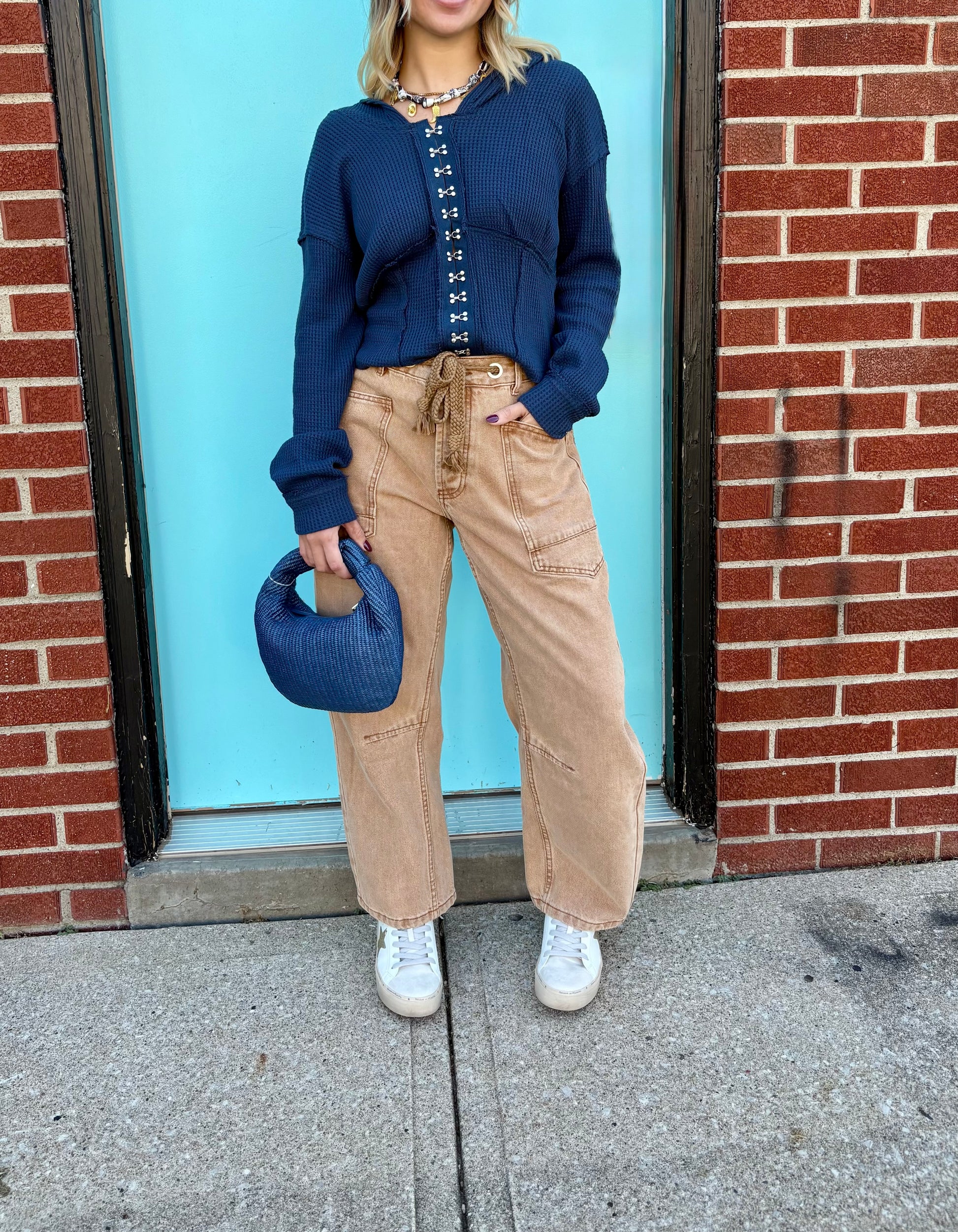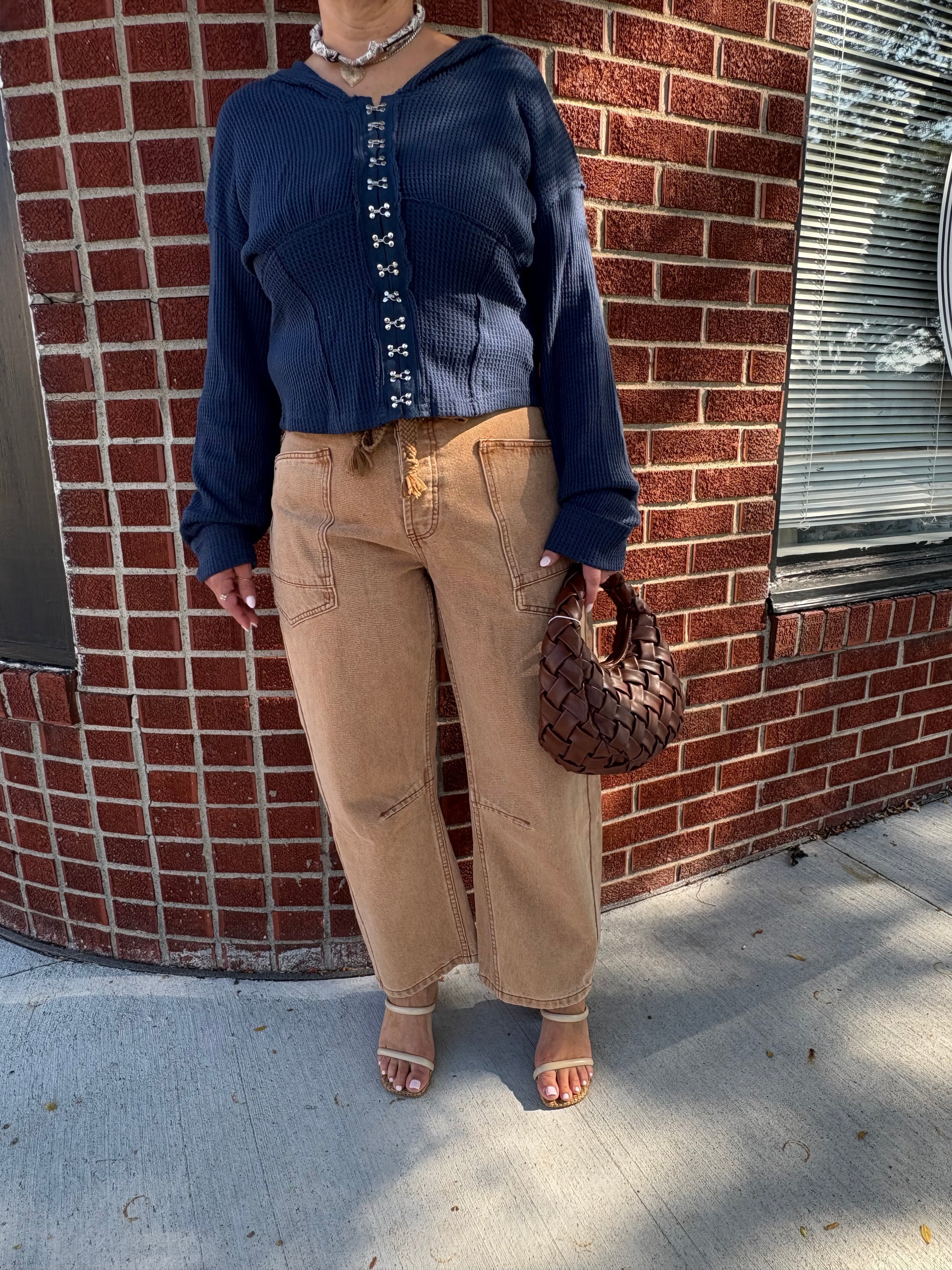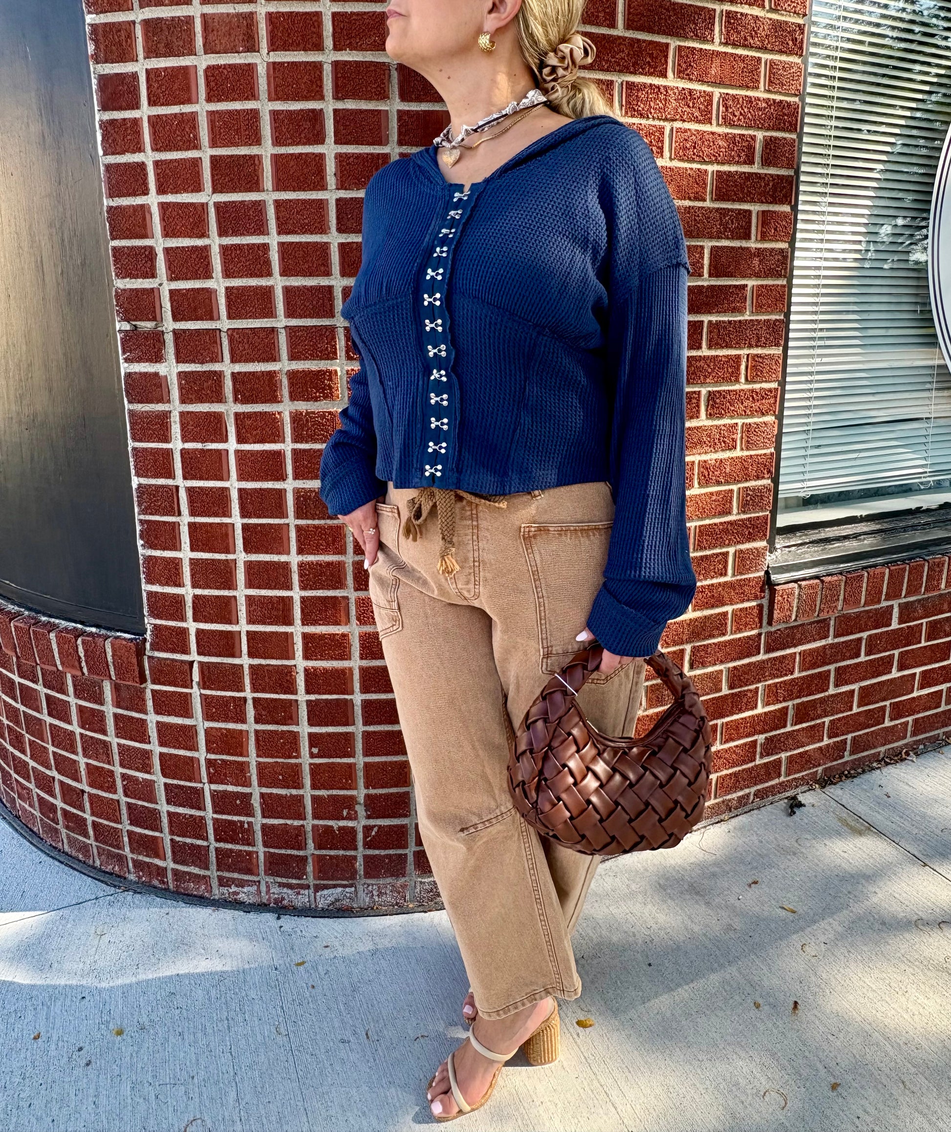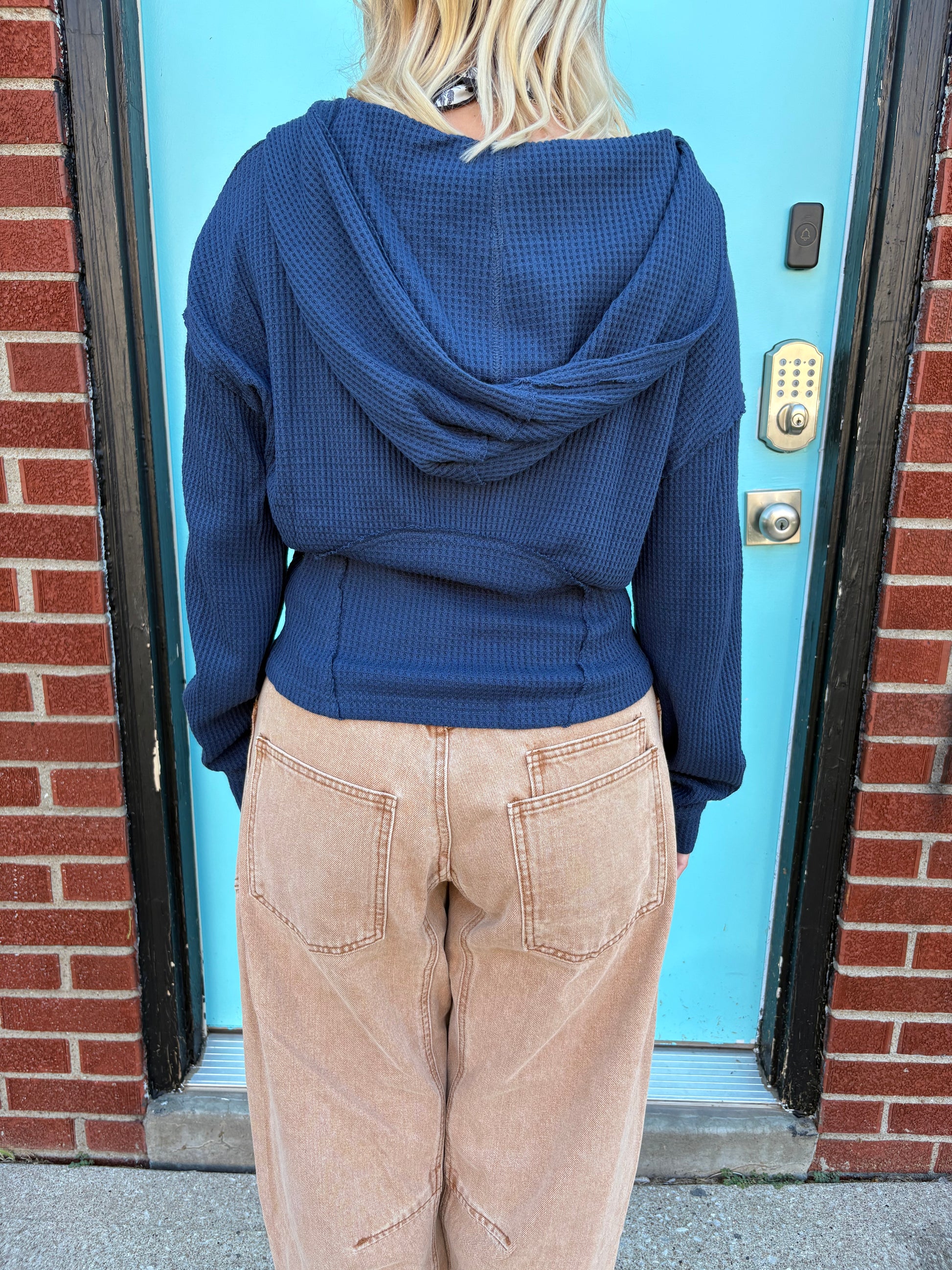 Textured Thermal Fabric: Made from a cozy waffle knit for a laid-back yet structured look - Corset-Inspired Fit: Seamed waistline and curve-enhancing silhouette flatter your shape - Hook-and-Eye Closure: Unique front metal closures add an edgy vintage detail - Long Sleeves: Relaxed sleeves with fitted cuffs for easy movement and comfort - Attached Hood: Adds a casual twist to the otherwise feminine, fitted design - Cropped Hem: Slightly curved hem pairs effortlessly with high-rise bottoms - Model is 5' 10.5" 32.5-24-37 and wearing a size Small Equal parts cool and romantic, this waffle hoodie blends soft comfort with street-ready structure. Styled with denim, leggings, or cargo jeans, it effortlessly channels trending Western, Tops, and Boho vibes while standing out in any casual rotation.