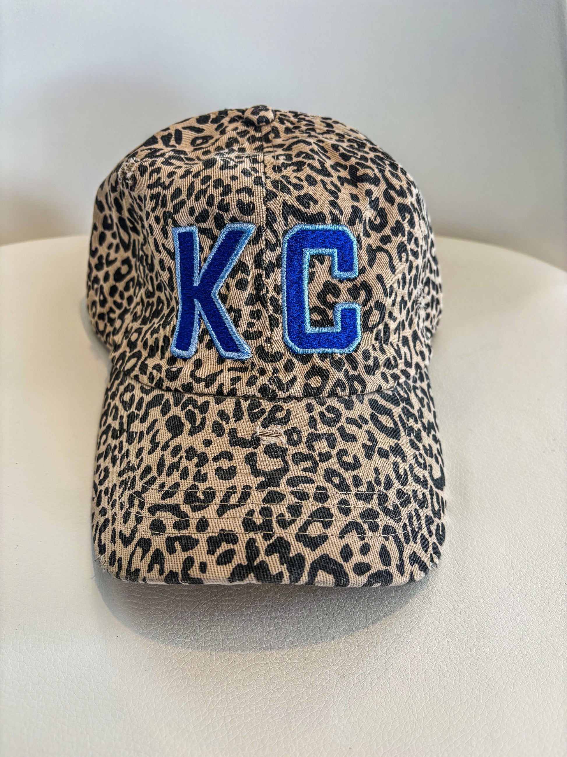 Add a touch of wild to your game day look with our KC Leopard Distressed Baseball Cap! Made with soft cotton, this vintage-inspired cap features a playful leopard print and a distressed finish. Perfect for any Chiefs or Royals fan looking to stand out at the game (and maybe even catch the attention of a wild cat or two)!