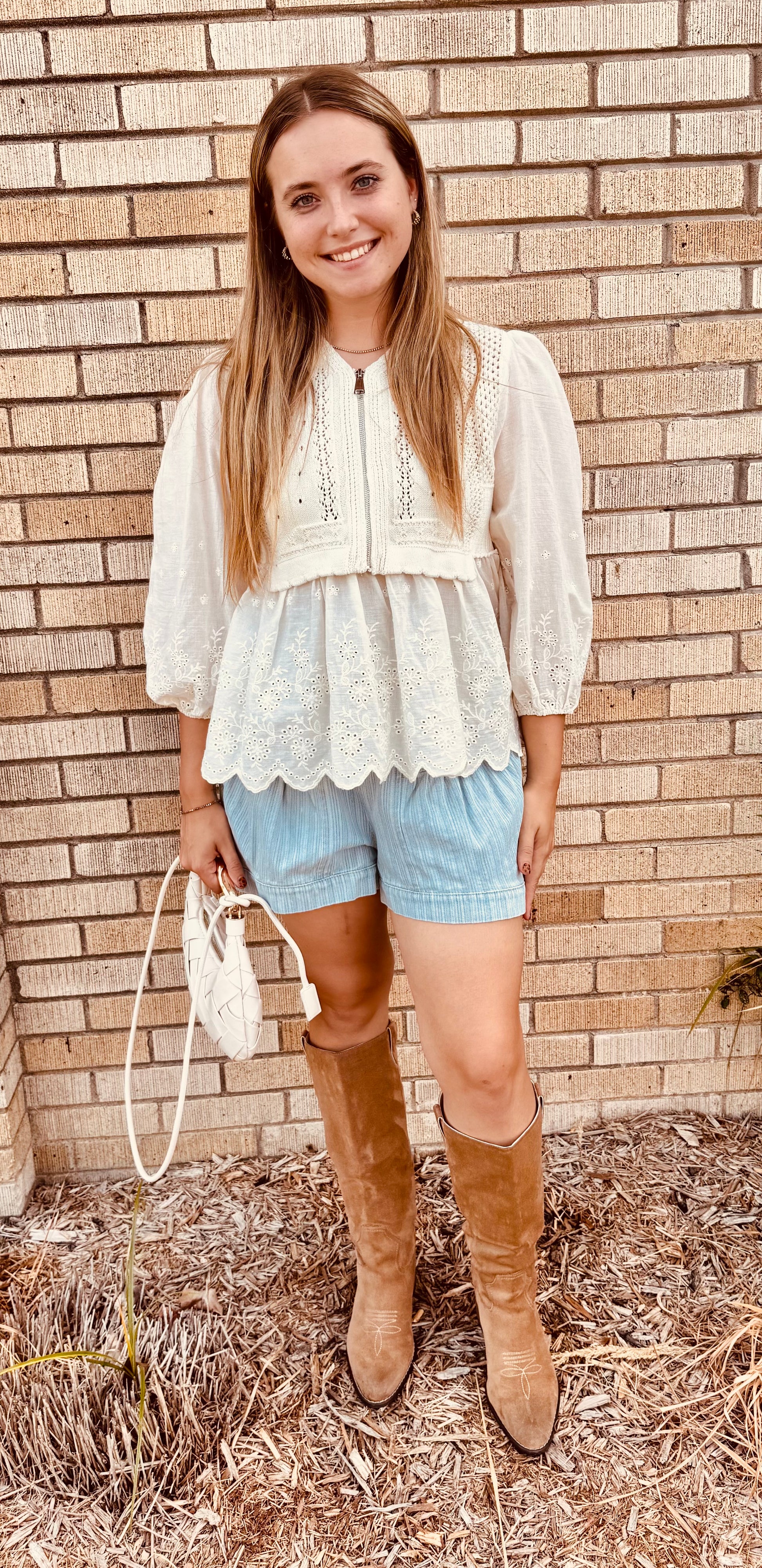 Mason Babydoll Sweater Half Zip-Erin Rose Boutique-This mixed media sweater combines soft textures with a relaxed babydoll silhouette for an effortlessly stylish look. It features a half zip-up sweater vest layered over an embroidered blouse-style bottom. Voluminous sleeves and a scalloped hem add a feminine and elevated touch.
