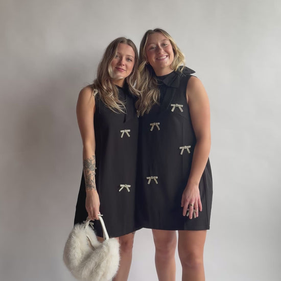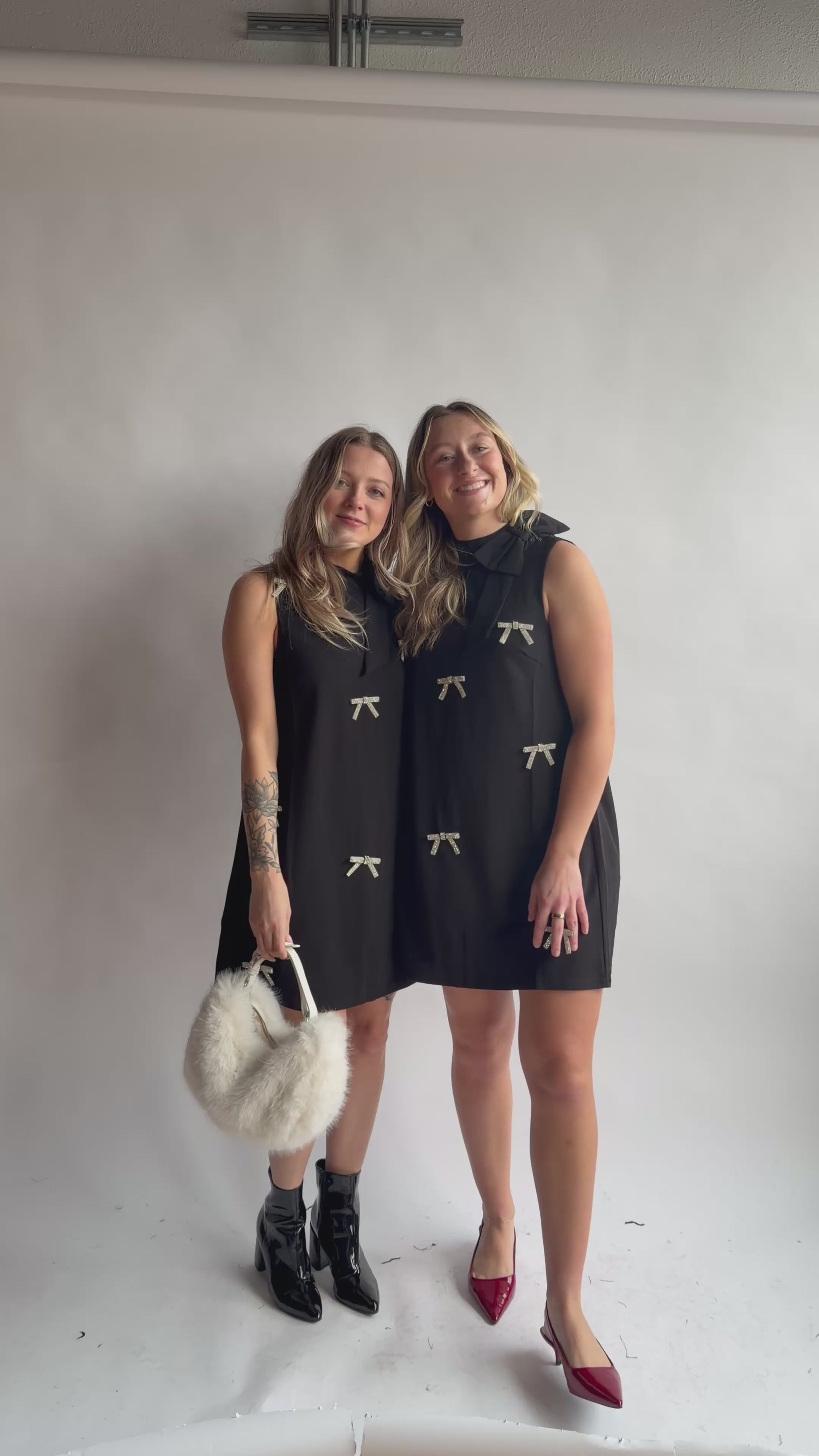 Make every moment sparkle in this charming dress designed to dazzle. This mini dress features rhinestone bow accents, a flattering A-line silhouette, sleeveless cut, side pockets, and a delicate neck bow detail, plus a back keyhole and invisible zipper for a seamless finish. Style it with strappy heels and a glittery clutch for a perfect party-ready look.